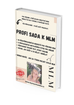TOP produkt z mé nabídky e-booků. Nejprodávanější. Profi sada pro každého, kdo dělá MLM a nedaří se mu tak, jak by si představoval. Připravených 10 inzertních fotek ihned k použití, které jsou magnetem na nové zájemce. 5 motivačních fotek ke sdílení. A hlavně připravený text, který si upravíte dle svého MLM. Poutavě vede k registraci. Bonus navíc: Jak rozjet MLM za týden